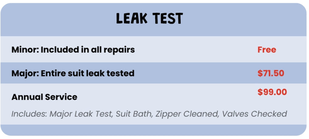 - Once your drysuit reaches our facility, our expert team will perform a detailed inspection and conduct a leak test according to your selected service level: Minor, Major, or Annual.